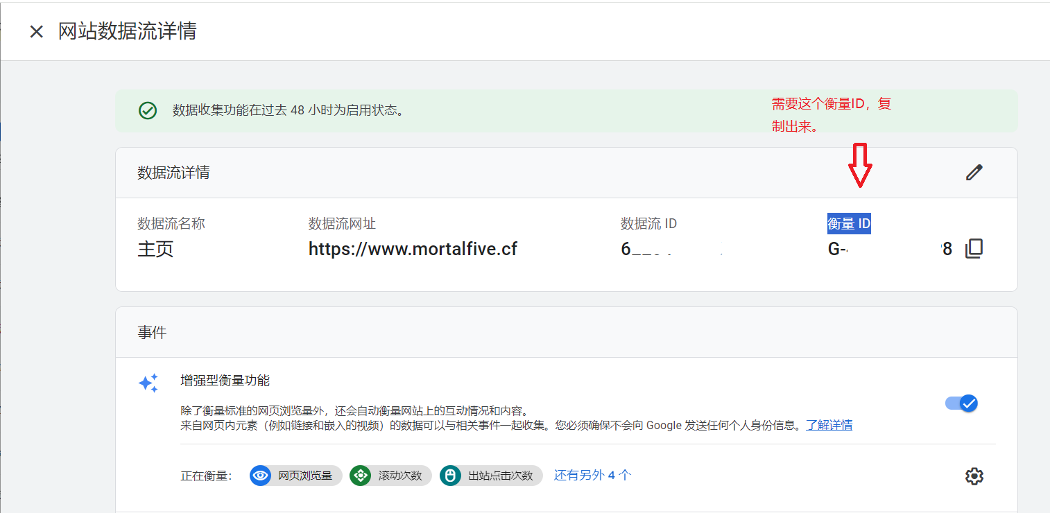 根据提示注册完毕后,到主页,右下角点管理-媒体资源下-数据流-点击网站数据流-复制衡量 ID