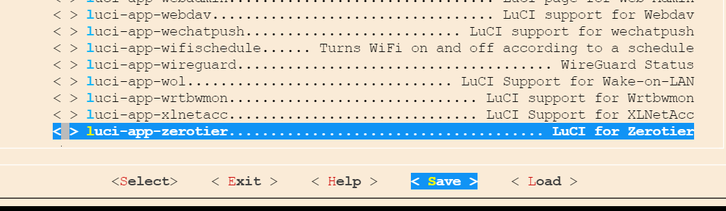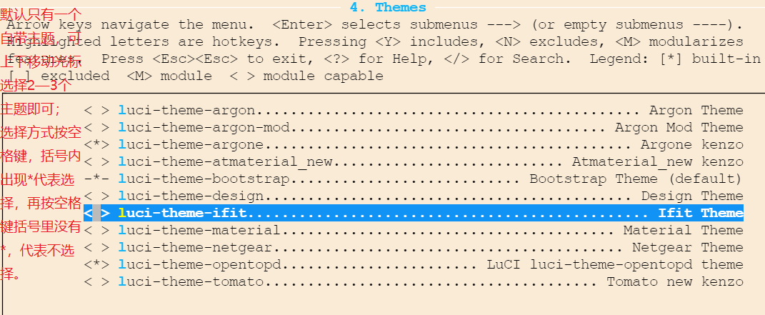 (2)进入LuCI选项,光标上下移到LuCI,按回车键进入,再选择 Themes 选项进入;默认只有一个自带主题,可上下移动光标选择2—3个主题即可; 选择方式按空格键,括号内出现代表选择,再按空格键括号里没有,代表不选择。