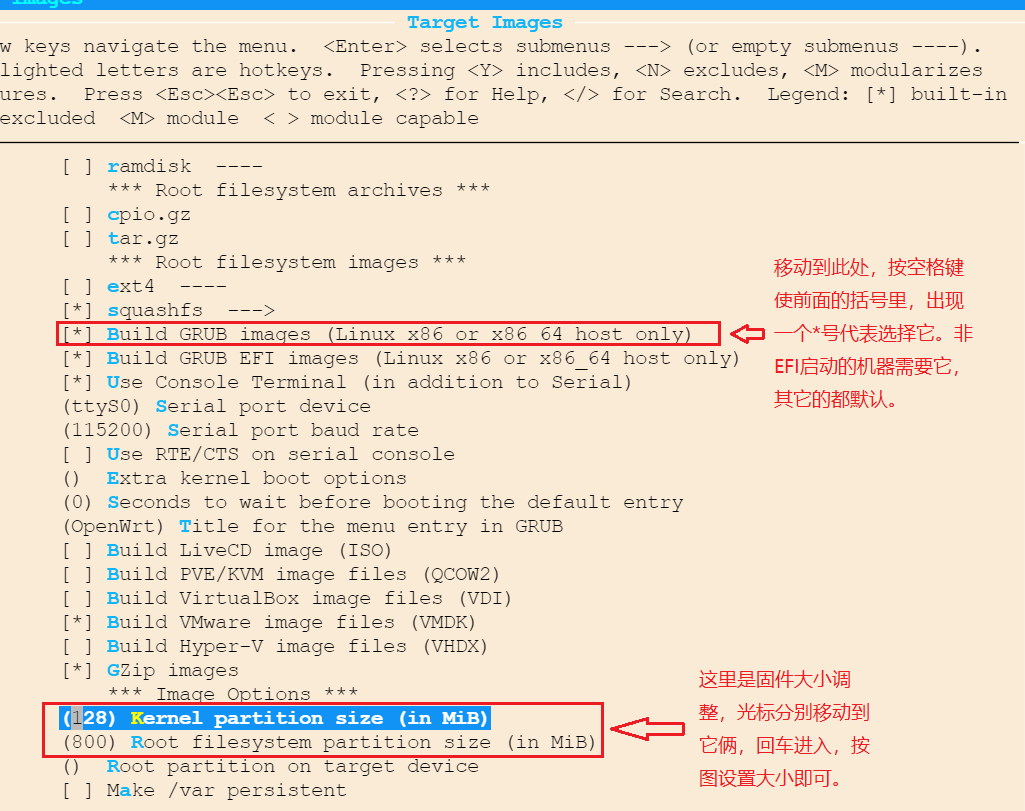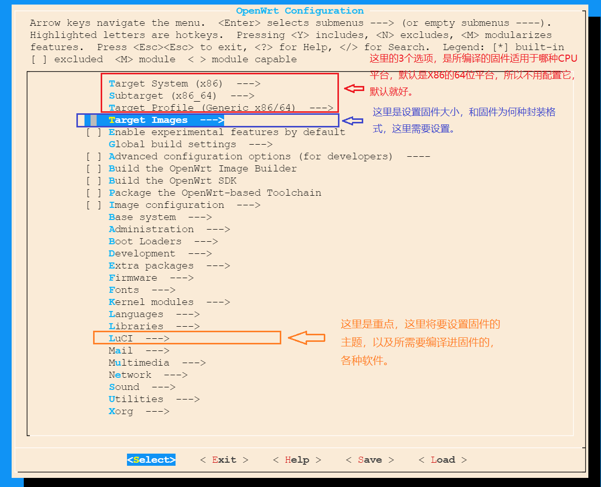 进入了编译界面后。作为初学者,就先了解几处需要配置的地方即可,其它方面默认。