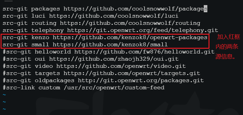 (5) 添加软件源,输入命令vim feeds.conf.default,进入下列界面,把下面两条软件源信息加入