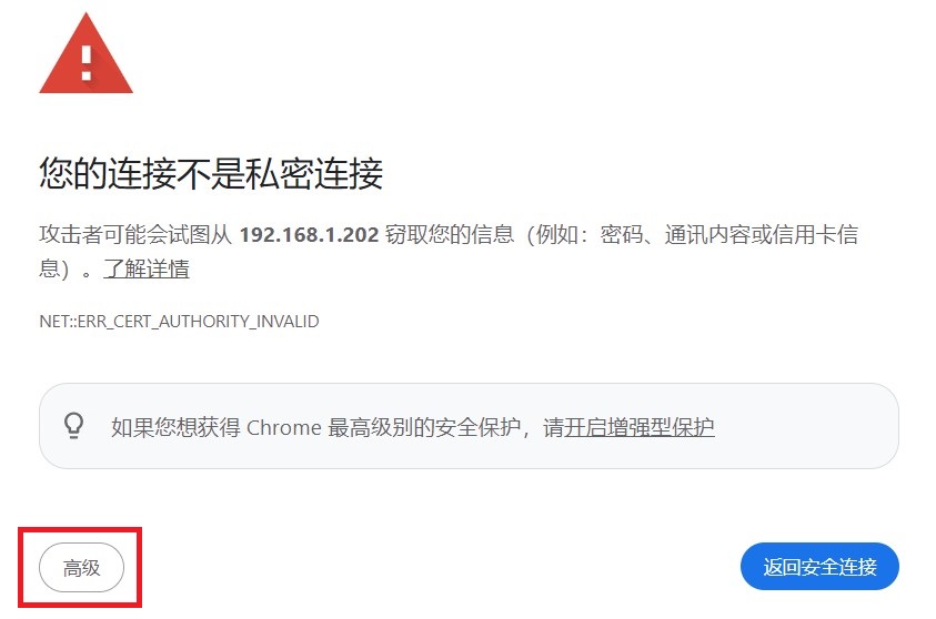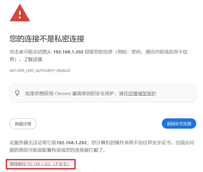 (2)然后用在同一局域网的电脑打开浏览器,在浏览器地址栏输入https://192.168.1.202:8006(一定是英文的:以及开头一定是https://).此刻会跳出-您的连接不是私密连接,然后点击高级