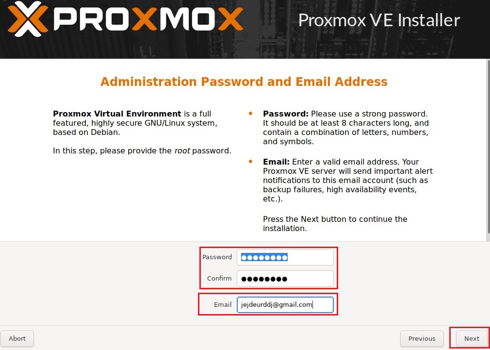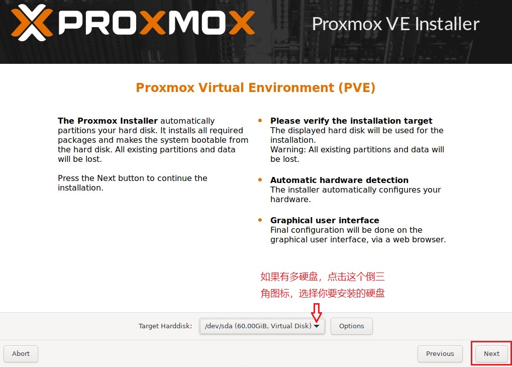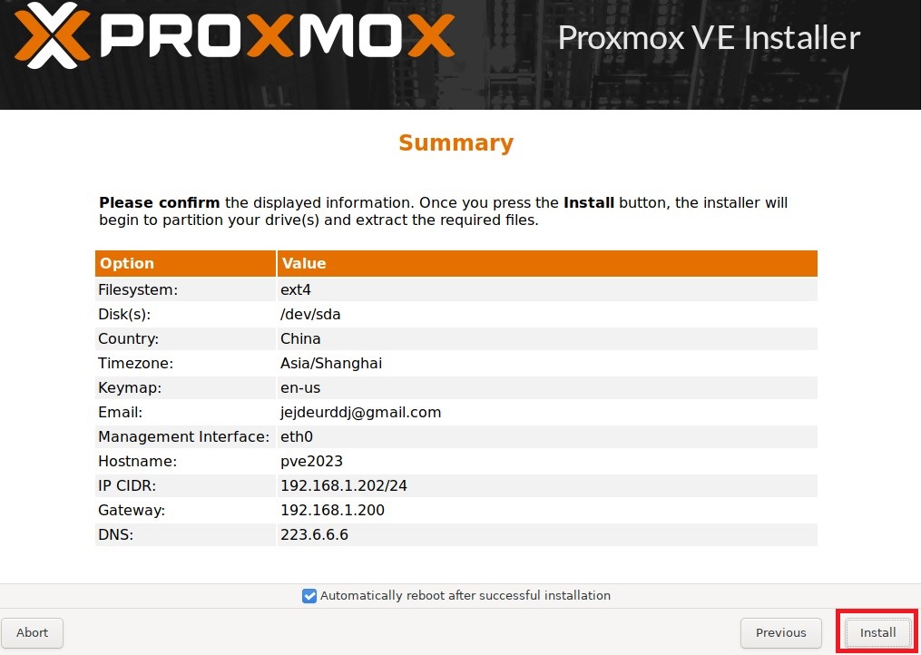 (7)最后一步是检查你的 pve 相关设置,如信息都正确,点击安装,等待安装完成就好。若需要修改信息,点击上一步(Previous)进行修改。