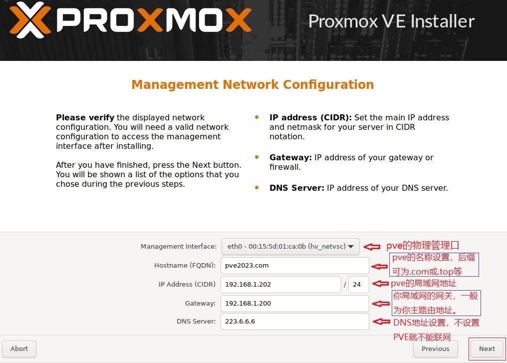 (6)网络置这一步也是重点;第一栏为pve物理管理口,只有一个网口的机器就不用管。如果是多网口机器,事先用手机拍下机器的网口MAC地址照片,机器网口上会标示网口的MAC地址所对应的网口。所以根据MAC地址来选择你想要的哪一个网口为管理口。在安装好后管理口就很难更改了。