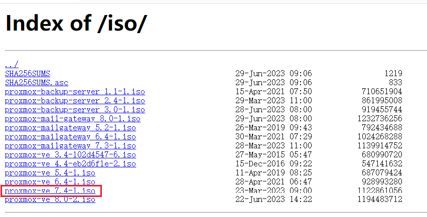 (1)首先我们要下载好PVE.ISO镜像文件,点击下载地址,推荐下载7.4-1的ISO文件,8.0版本由于是新出的大更新版本,让它再飞几个版本吧。