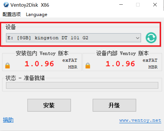 (3)开始制作U盘驱动器,准备一个容量至少8G且无数据的U盘插入电脑;解压Ventoy工具,运行解压后文件夹内的Ventoy2Disk.exe程序。在设备栏选择U盘,点安装按提示操作,直到完成。