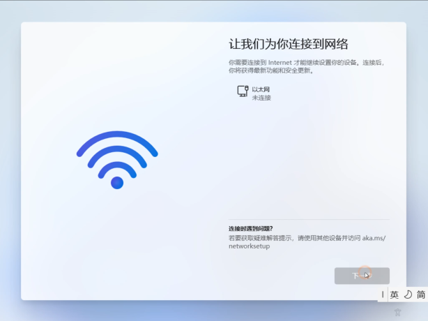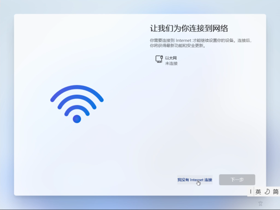 然后再到达这一步时,就可以选择 我没有网络连接的选项,进行完成安装。
