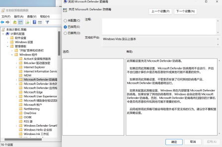 计算机配置-管理模板-Microsoft Defender防病毒-打开关闭Microsoft Defender防病毒-选择已启用-应用确定