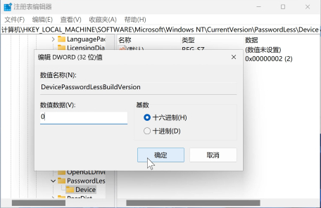 然后定位到: 计算机\HKEY_LOCAL_MACHINE\SOFTWARE\Microsoft\Windows NT\CurrentVersion\PasswordLess\Device
